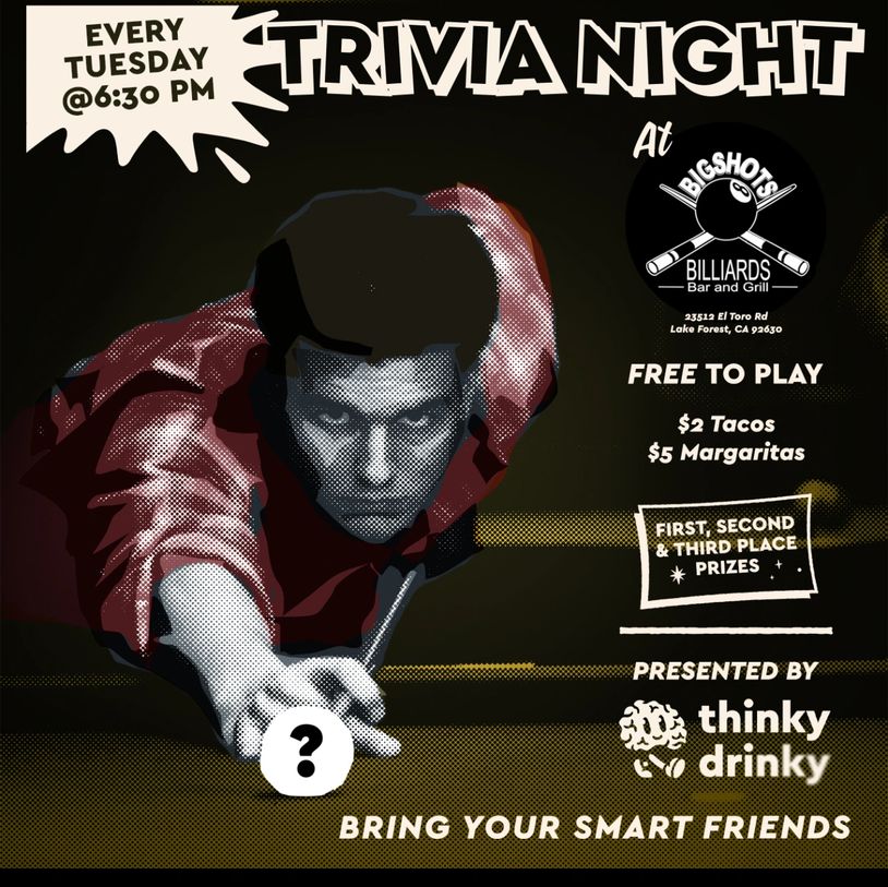 Bigshots hosts trivia every Tuesday night at 6:30pm! Cheap tacos and margaritas and some brain exercise presented by thinkydrinky.